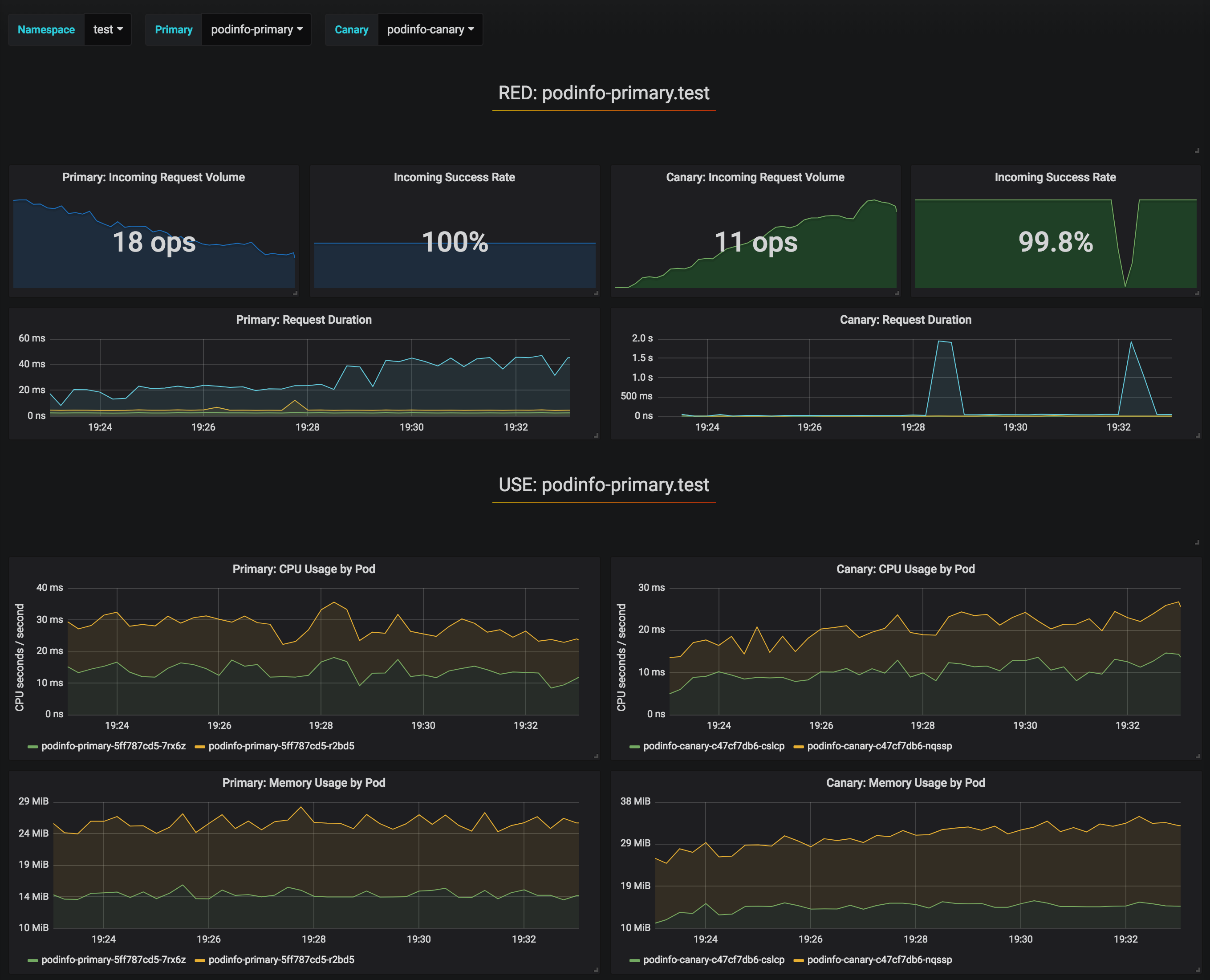 would provide us with a view of different metrics (cpu, memory, request duration, response errors,…) of the incumbent and new versions side by side.